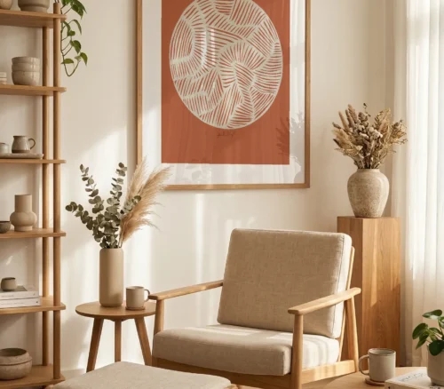 Inspired by the beauty of a sun-drenched sky and the gentle rhythm of nature, these hand-curated art prints feature a harmonious blend of terracotta tones, abstract landscapes, and botanical motifs. Each piece is a visual invitation to unwind, relax, and embrace the beauty of the moment