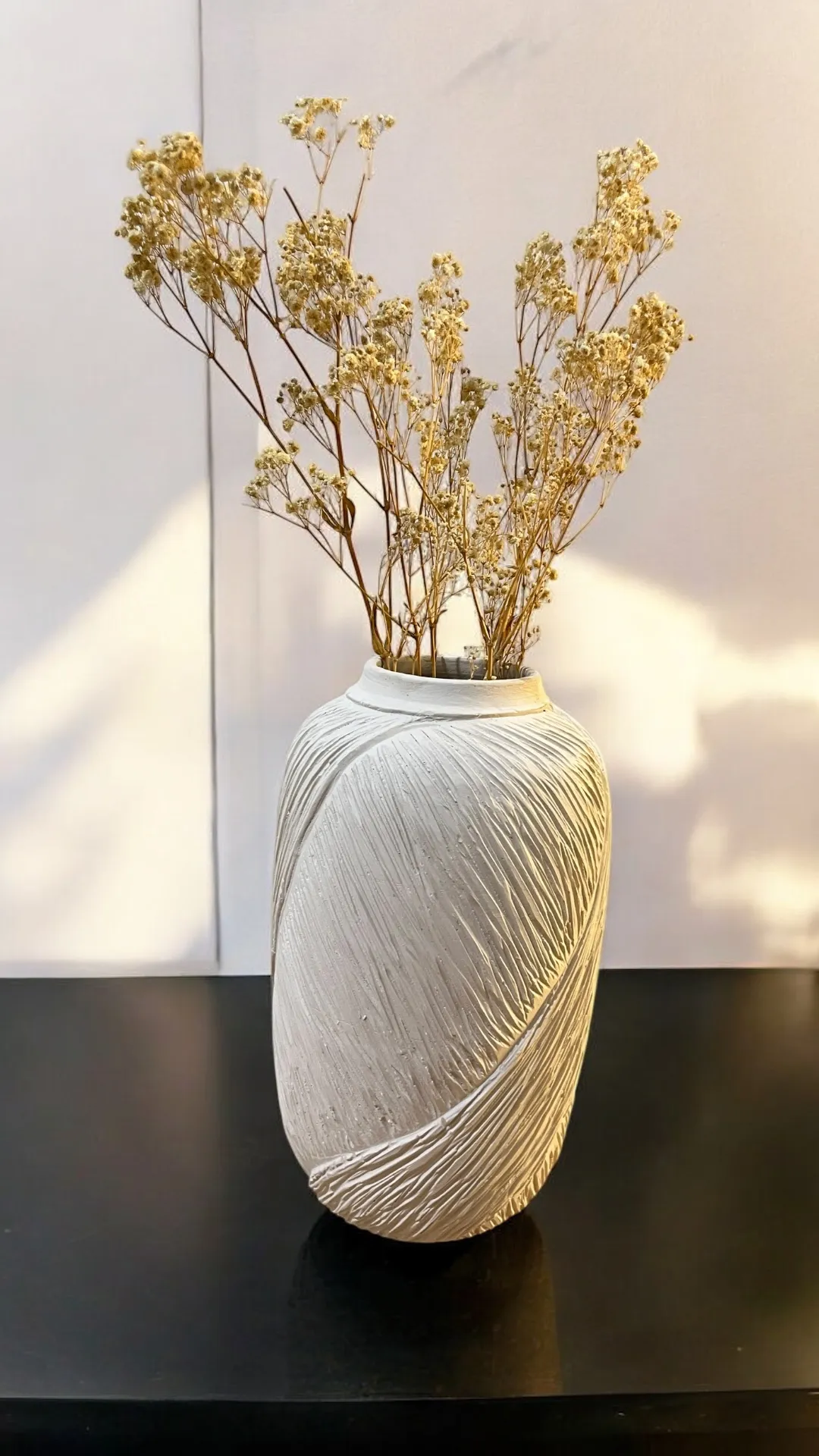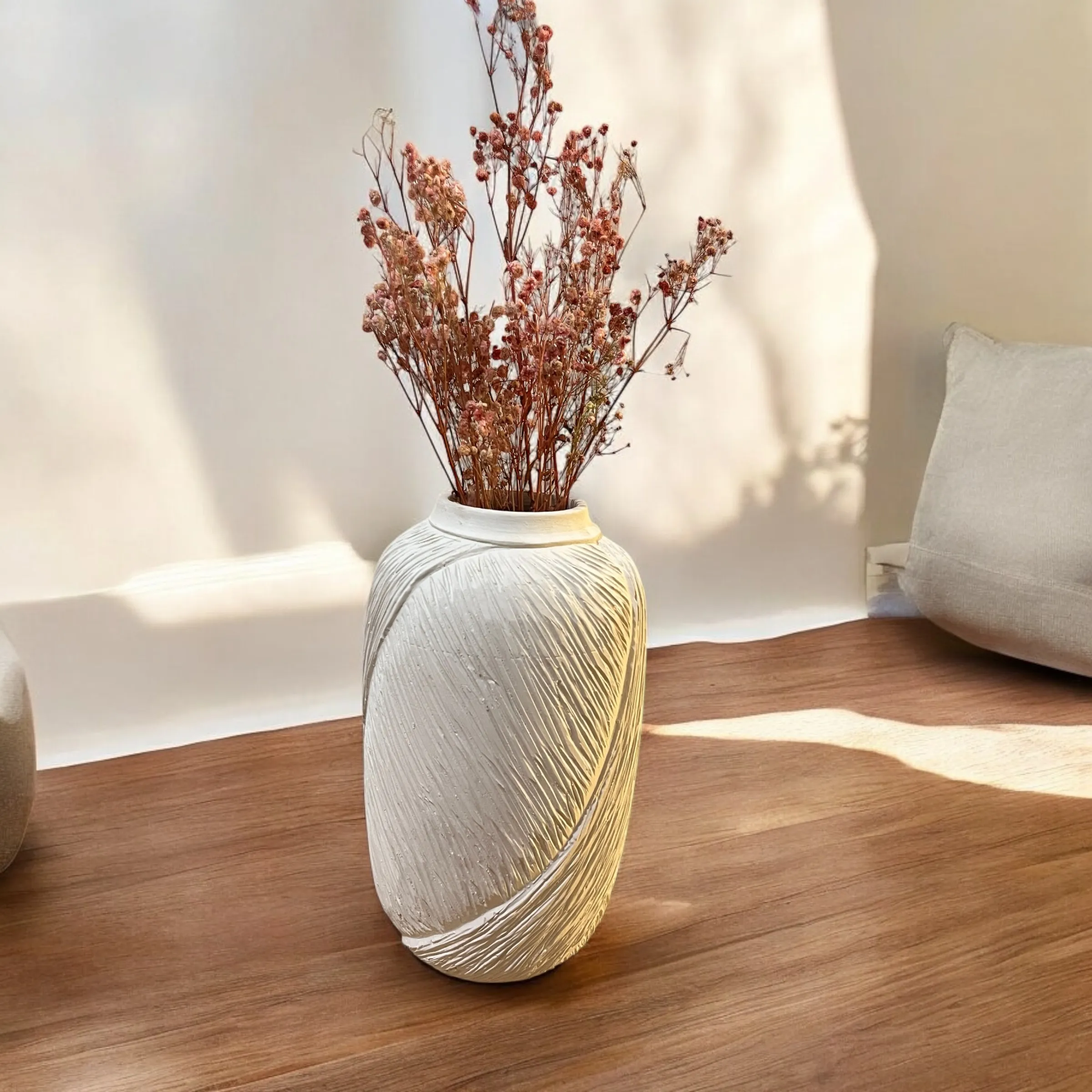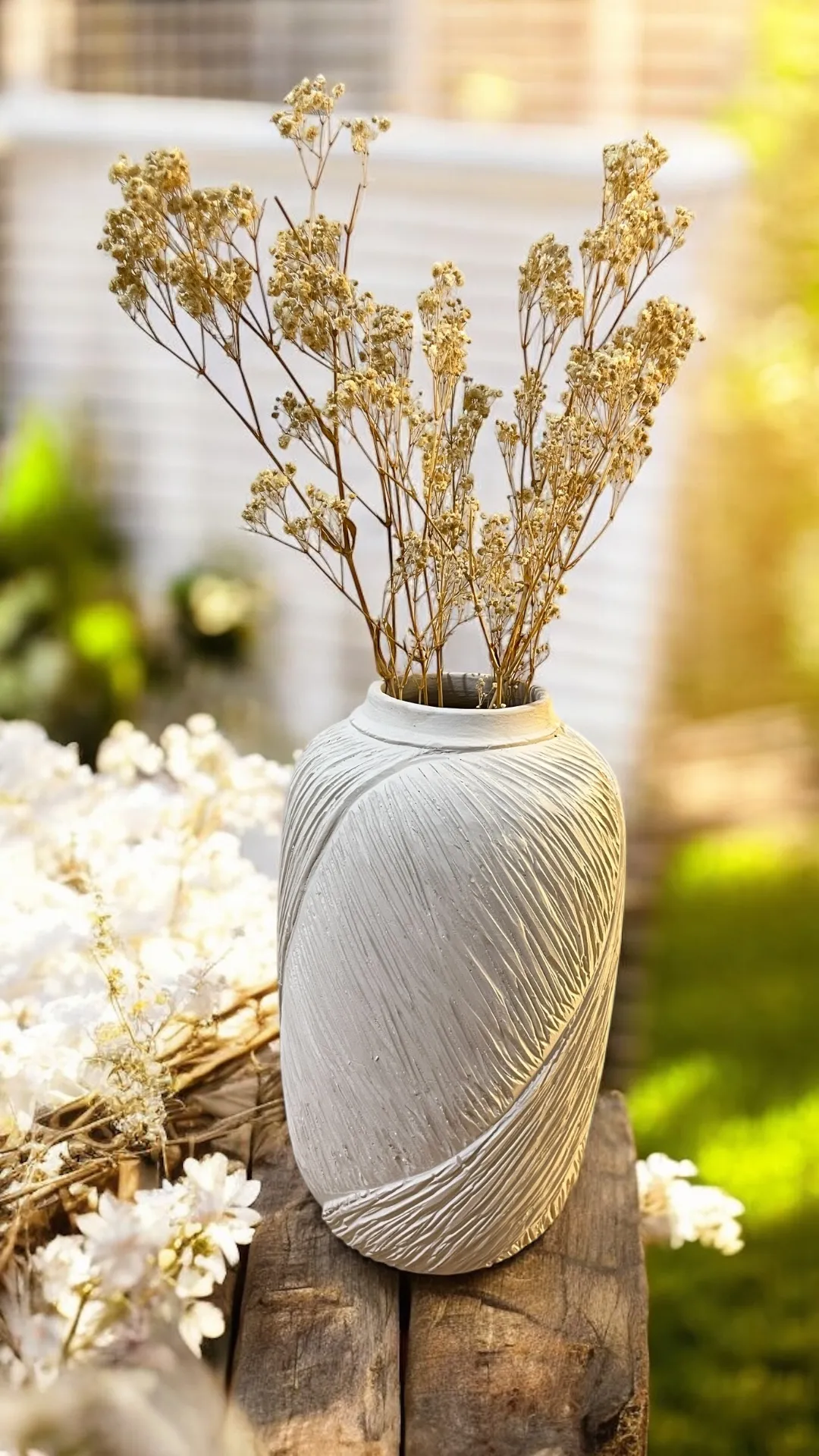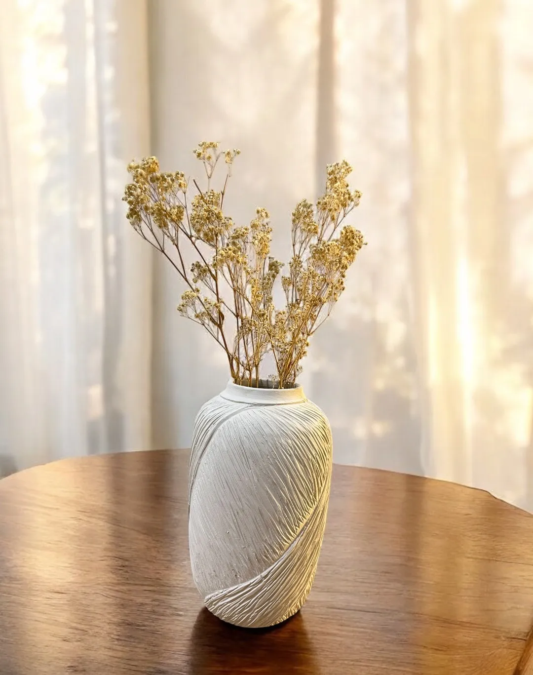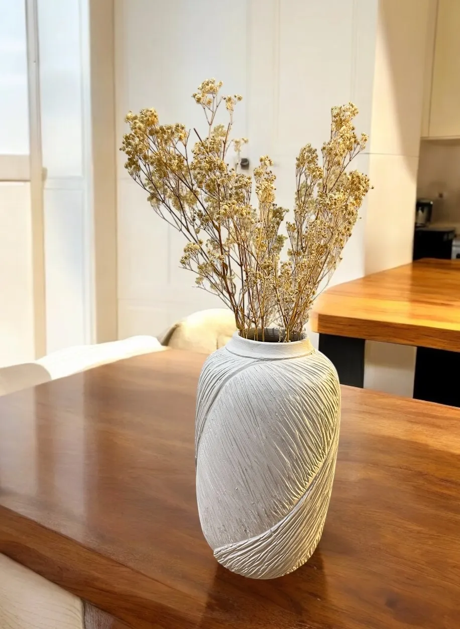 Our Textured Vase brings a touch of understated elegance to your space. This beautifully crafted white vase features a unique, tactile texture that adds visual interest. Paired with delicate dried blooms, it creates a calming and natural focal point for any tabletop or shelf