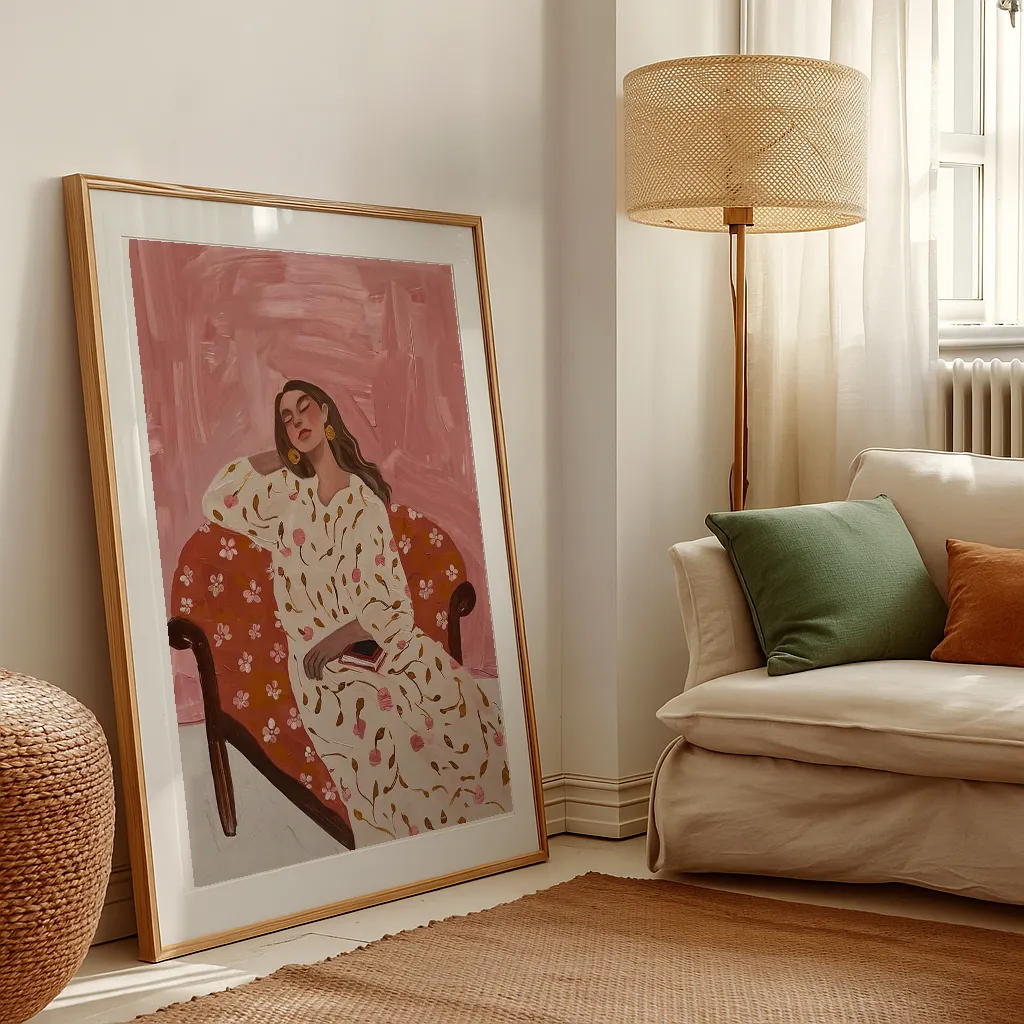 Bring a vibrant, expressive mood to your walls with this unique art print. The artwork depicts a woman basking in the sun’s glow, her eyes closed in peaceful contemplation. Her flowing, striped shirt and emerald green skirt create a beautiful contrast against the rich, warm background.